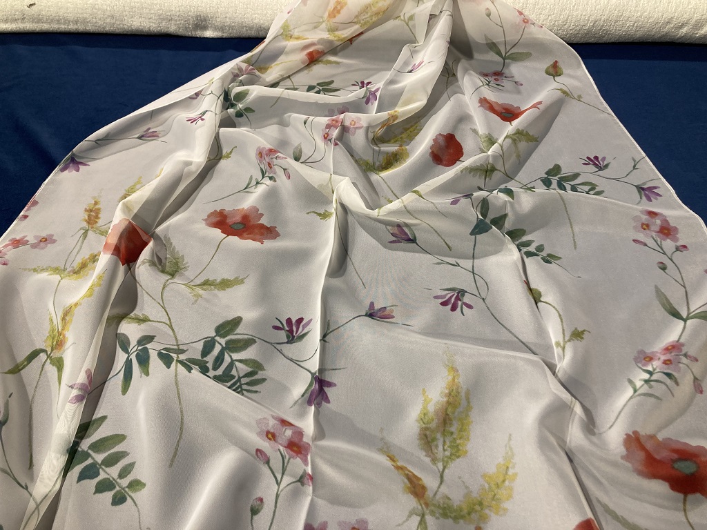 290 cm magas, fehér alapon színes virágmintás, vidám, tavaszias, finom tapintású voile függöny.