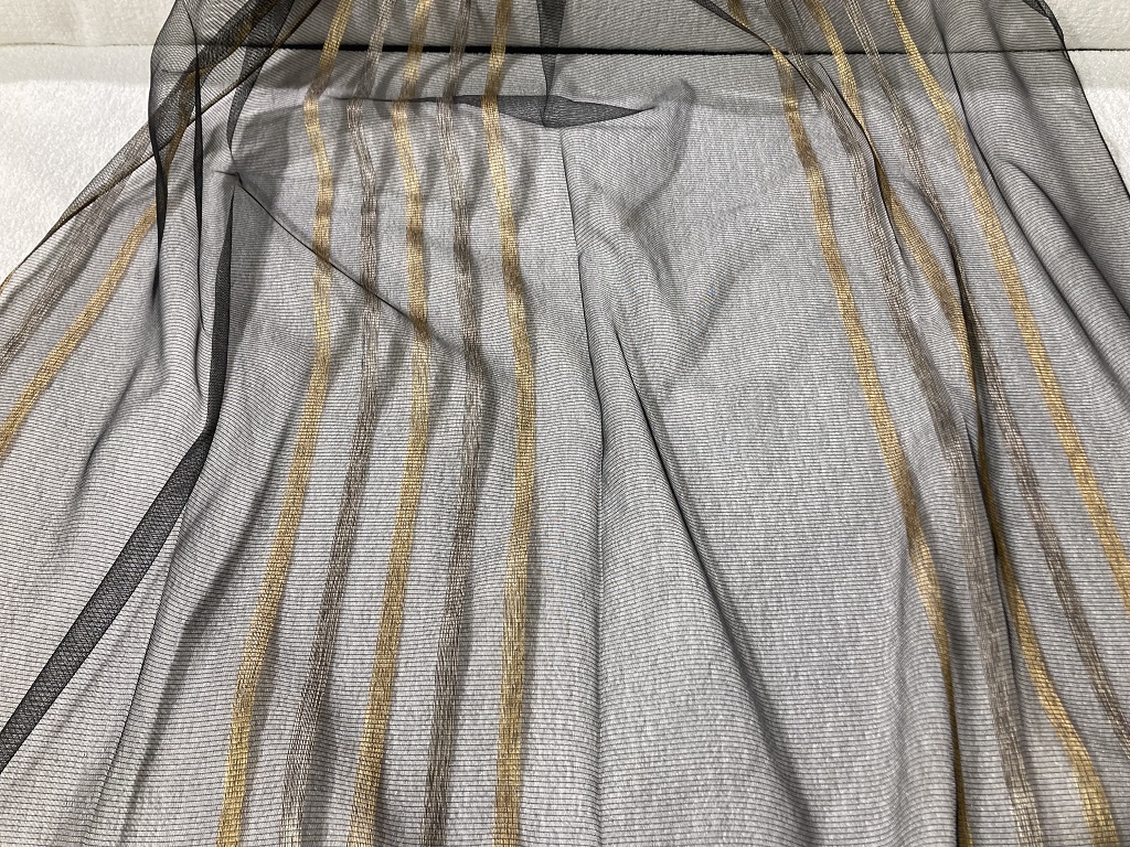 Fekete alapon fényes arany és ezüst csíkokkal díszített, ritka szövésű, jó fényáteresztő képességű könnyű függöny.