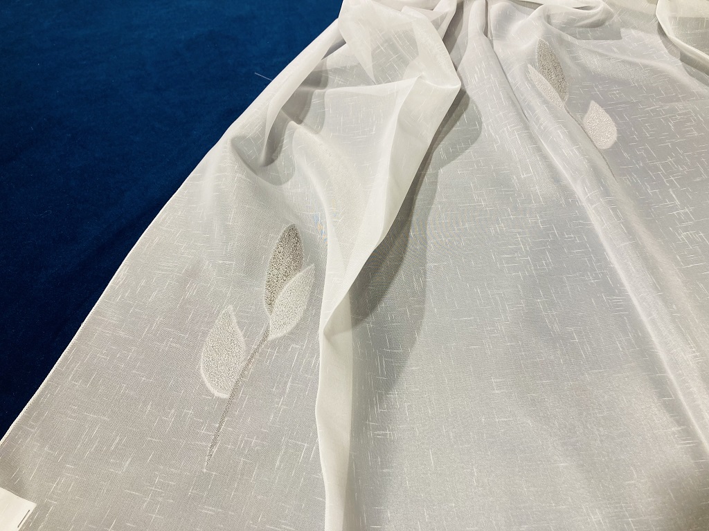 Fehér alapon szürke és ezüst levélmintás, fényáteresztő függöny, ólomzsinórral az alján.